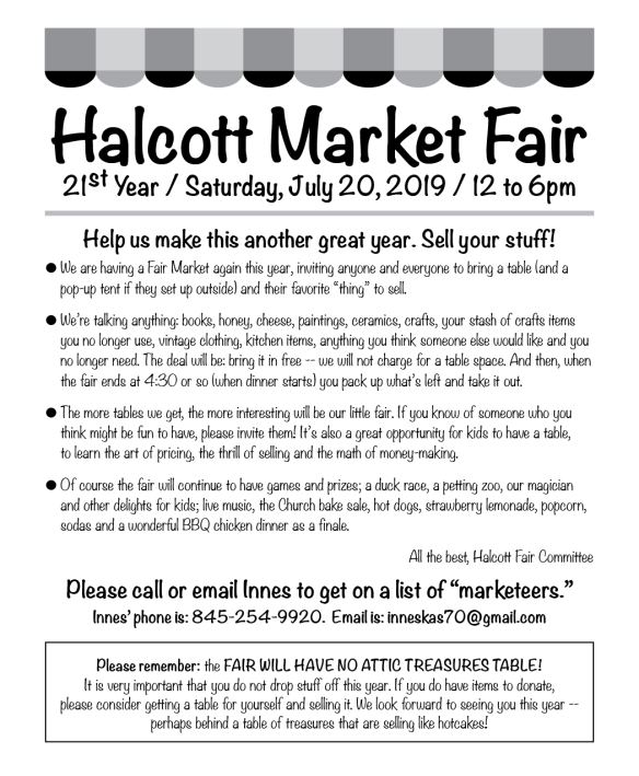21st Halcott Market Fair: Saturday, July 20, 2019 12 to 6pm Posted on June 25, 2019 by Lorraine M. See You There!