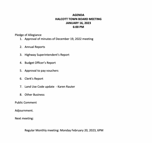 Agenda, Town Board Meeting, 16 January, 2023