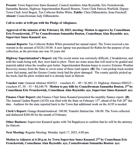 Town Board Meeting Minutes, March 20, 2023