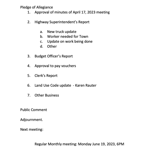 Agenda Town Board Meeting May 15, 2023 6PM