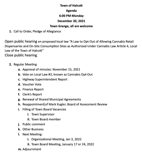 Revised Agenda, Town Board Meeting, 20 December, 2021