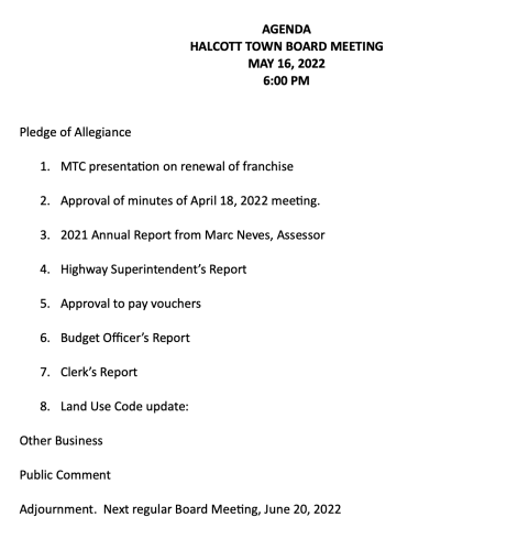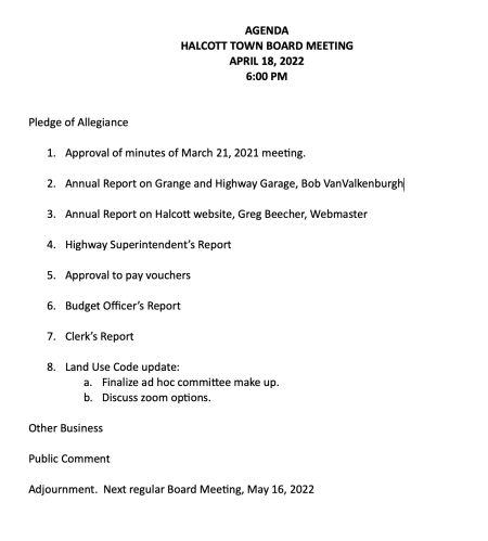 Agenda, Town of Halcott Board meeting 18 April 2022