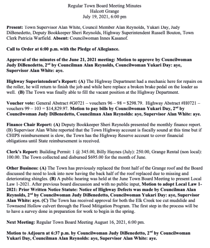 Town Board Minutes, July 19, 2021